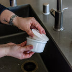 To clean dishes, use a wet brush or sponge and massage over dish soap. Begin to clean. If you'd like a thicker consistency, you can add a bit of water to your soap bar to get started, as your soap is used, it'll get easier to add a small pool of water during your dish washing sessions.